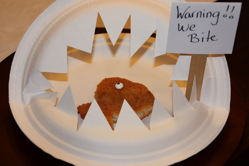 Paper plates cut like shark mouths, a clever menu and jell-o for dessert.